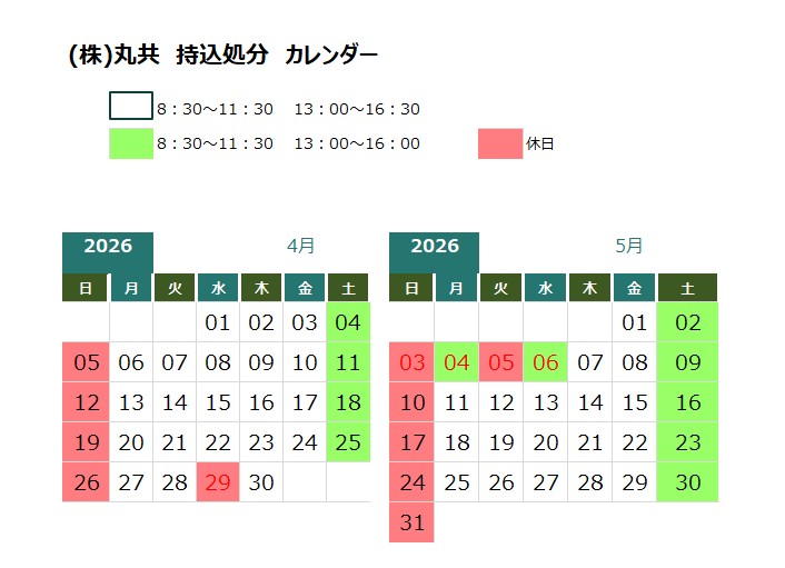 丸共では、土曜日はもちろん、5月4日(月)、5月6日(水)も持込処分受付OKです。